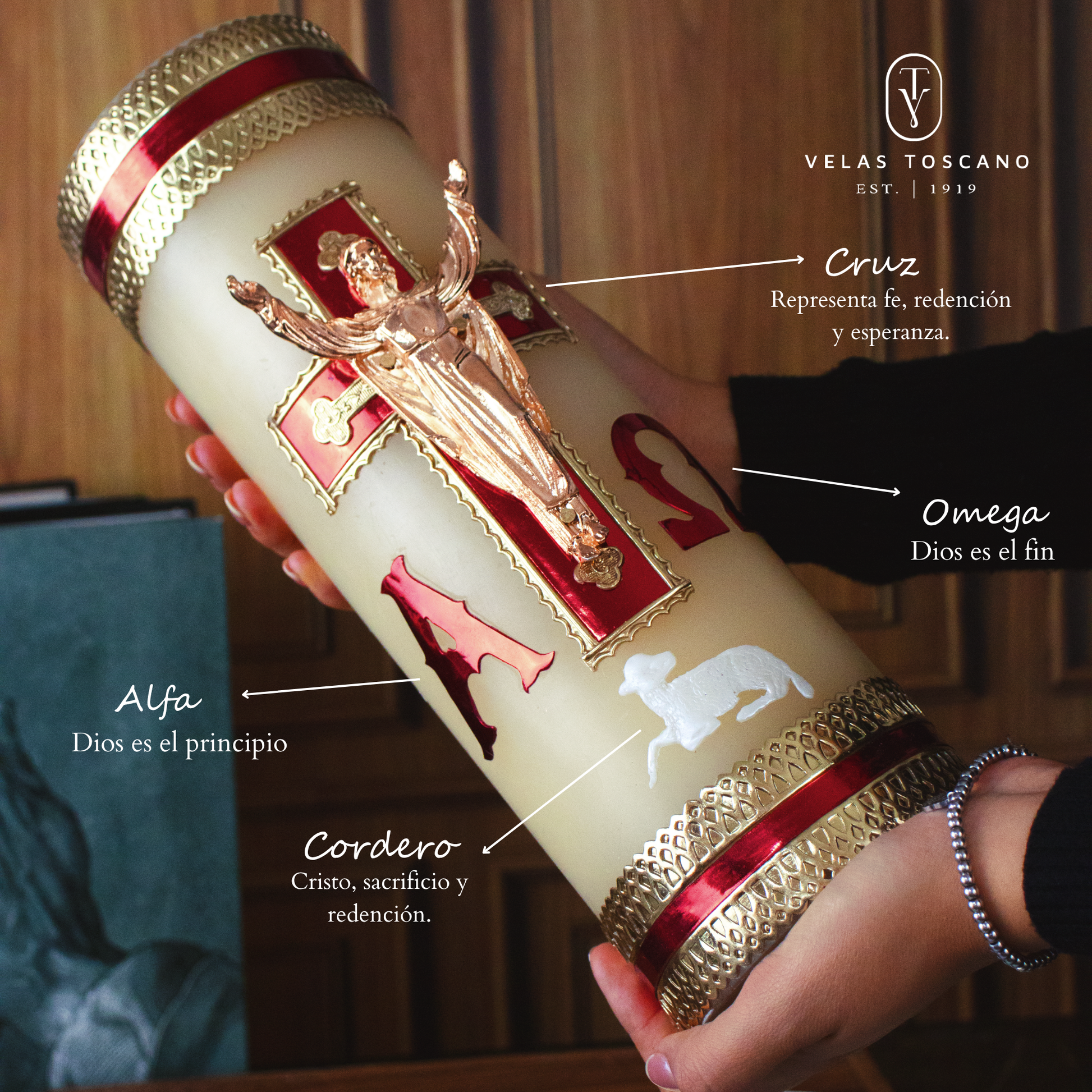 - Los símbolos que acompañan los Cirios Pascual son la Cruz, el Alfa, el Omega y el Cordero