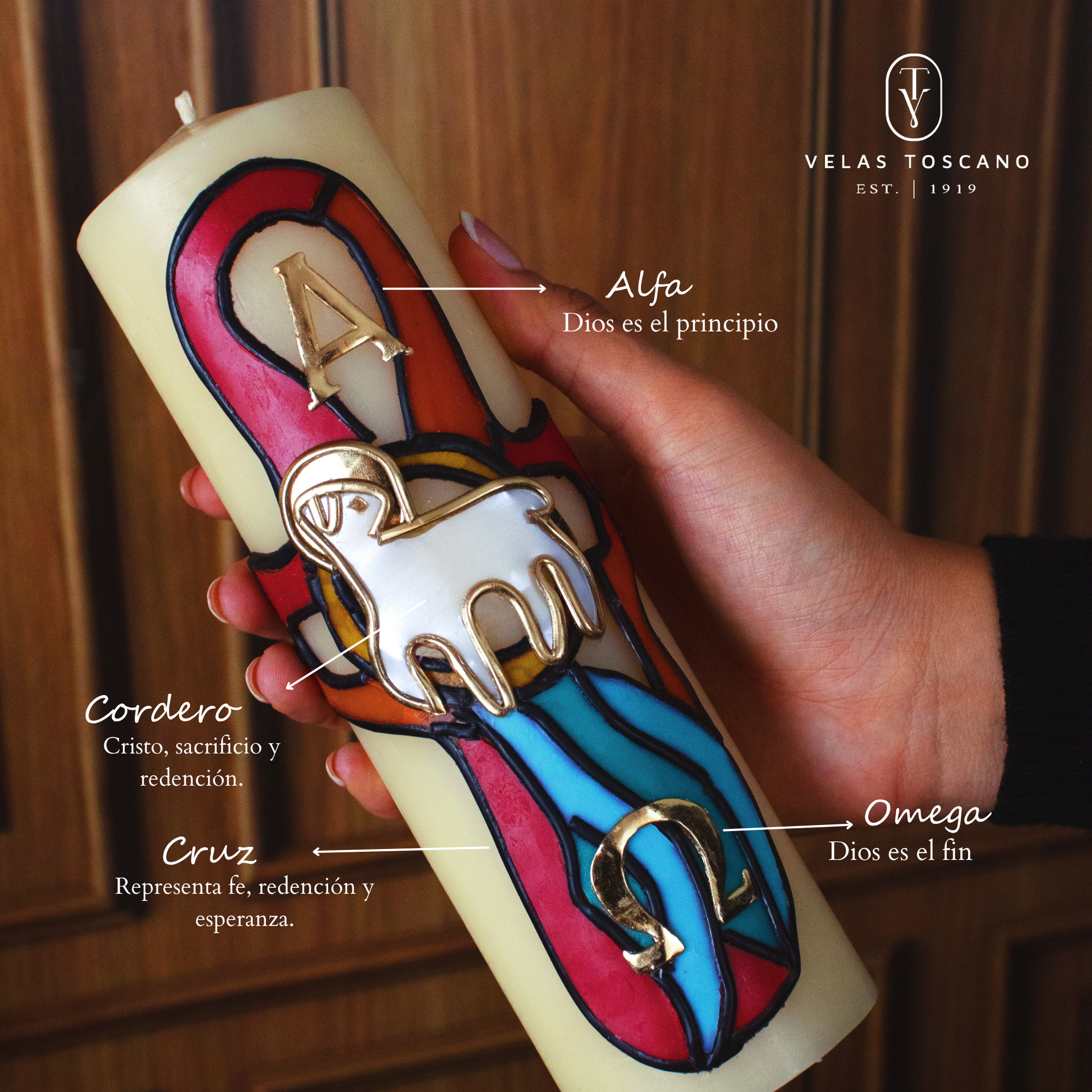 - Los símbolos que acompañan los Cirios Pascual son la Cruz, el Alfa, el Omega y el Cordero