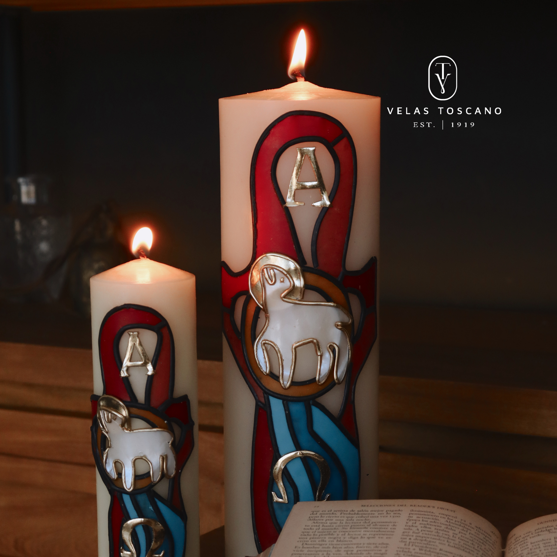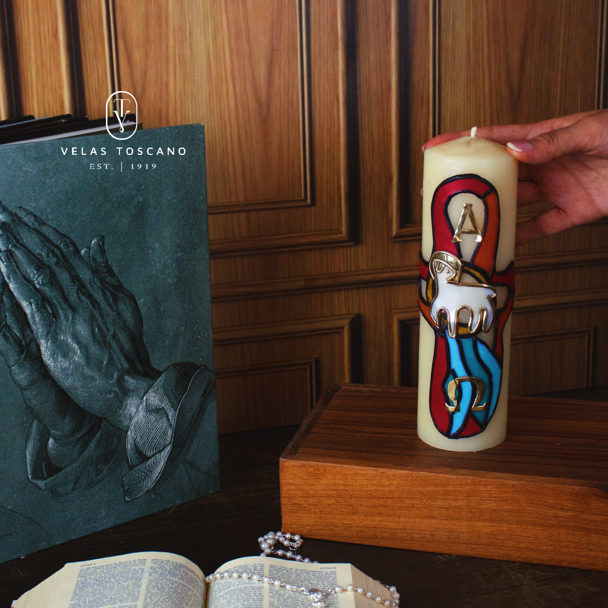 - El diseño ejemplar de nuestra línea de cirios, una cruz que asemeja un hermoso vitral de catedral hecho con cera tintada de color y con acabados dorados