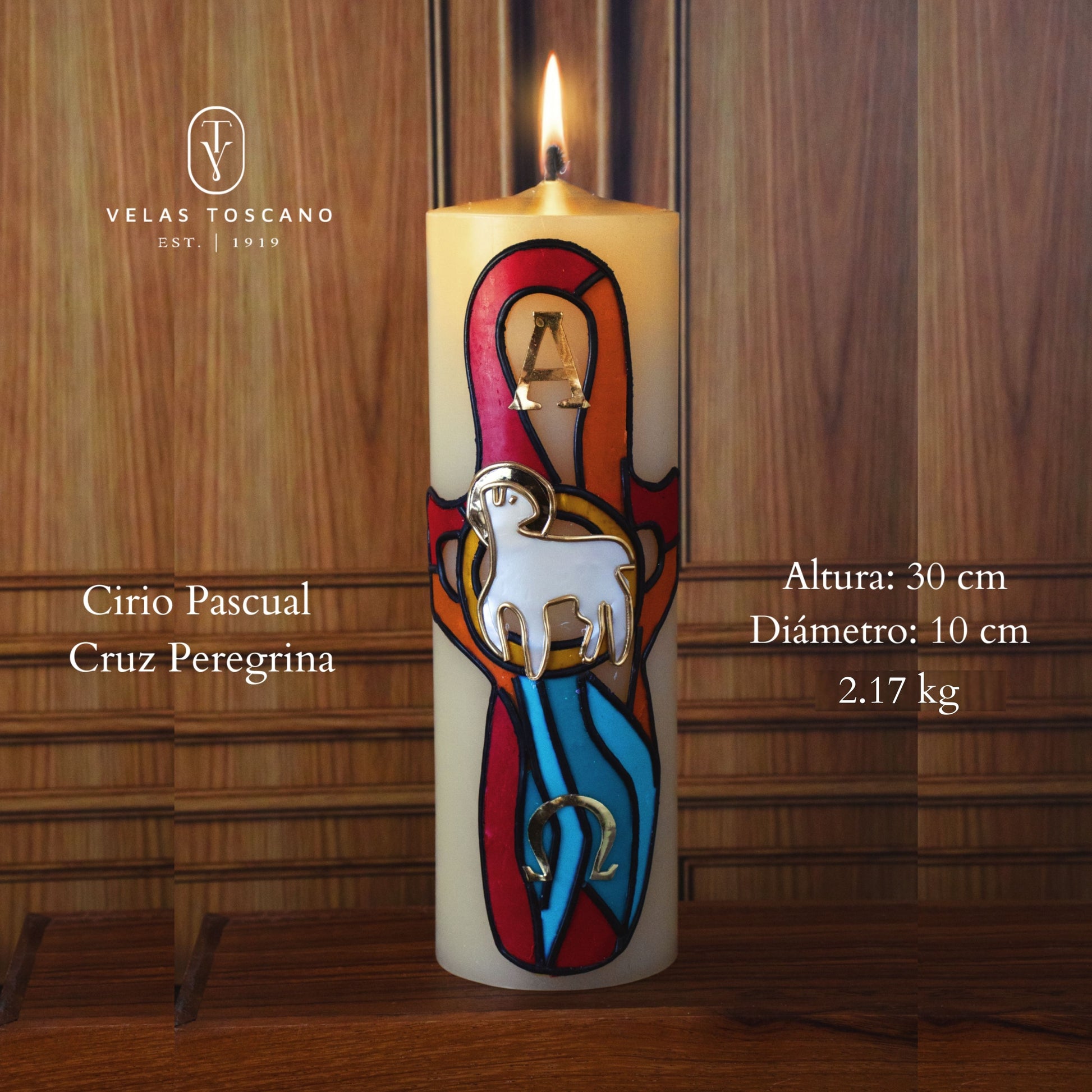 Descubre nuestro Cirio Pascual, hecho a mano con devoción y cuidado. Ilumina con amor y promesa de vida eterna. Con símbolos sagrados que guían y reconfortan en momentos de celebración y reflexión. Diseño sin igual de cruz y símbolos en cera y dorado.