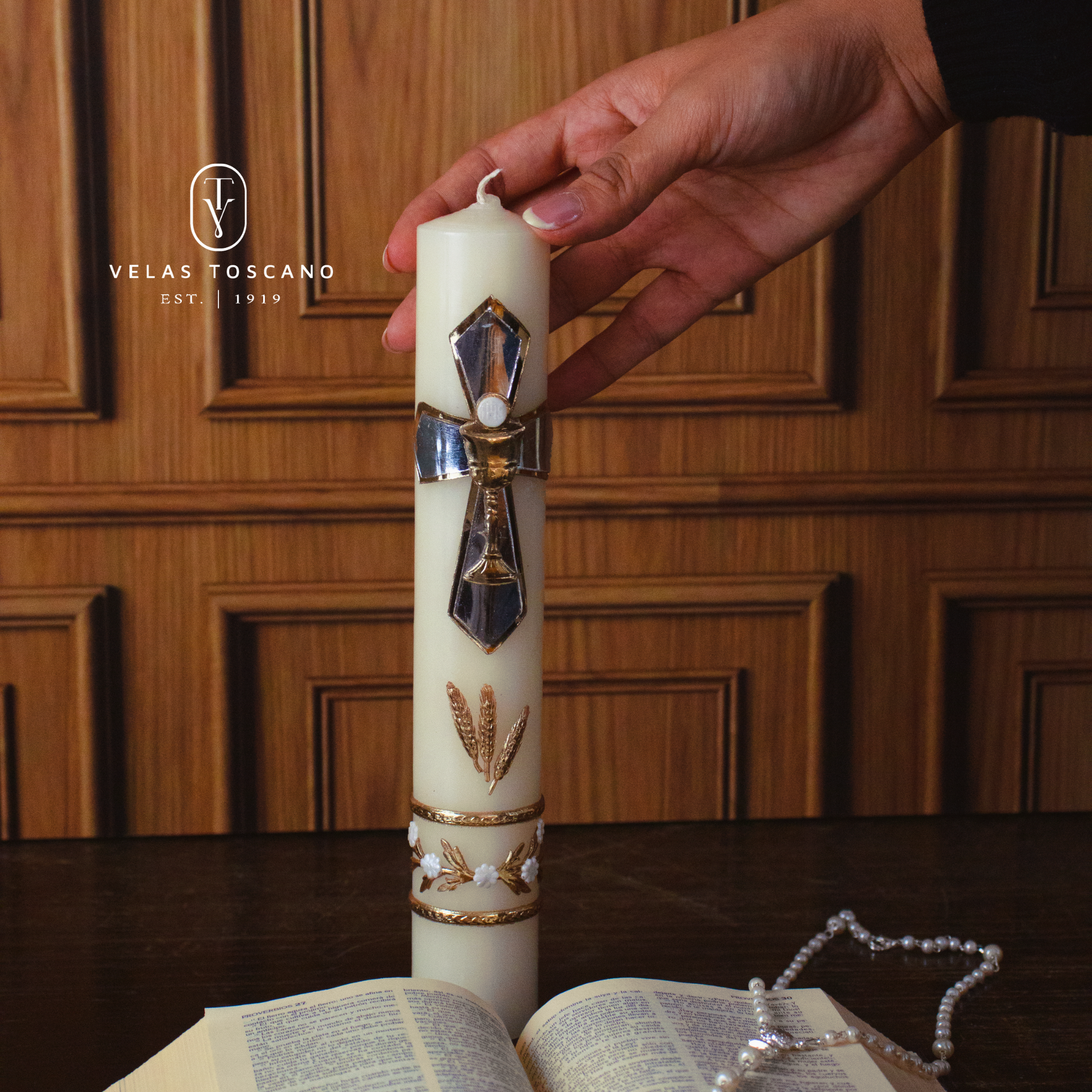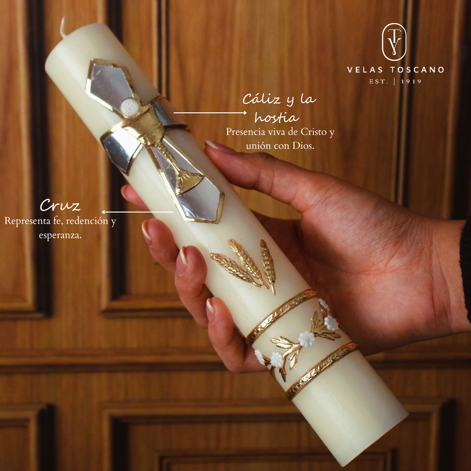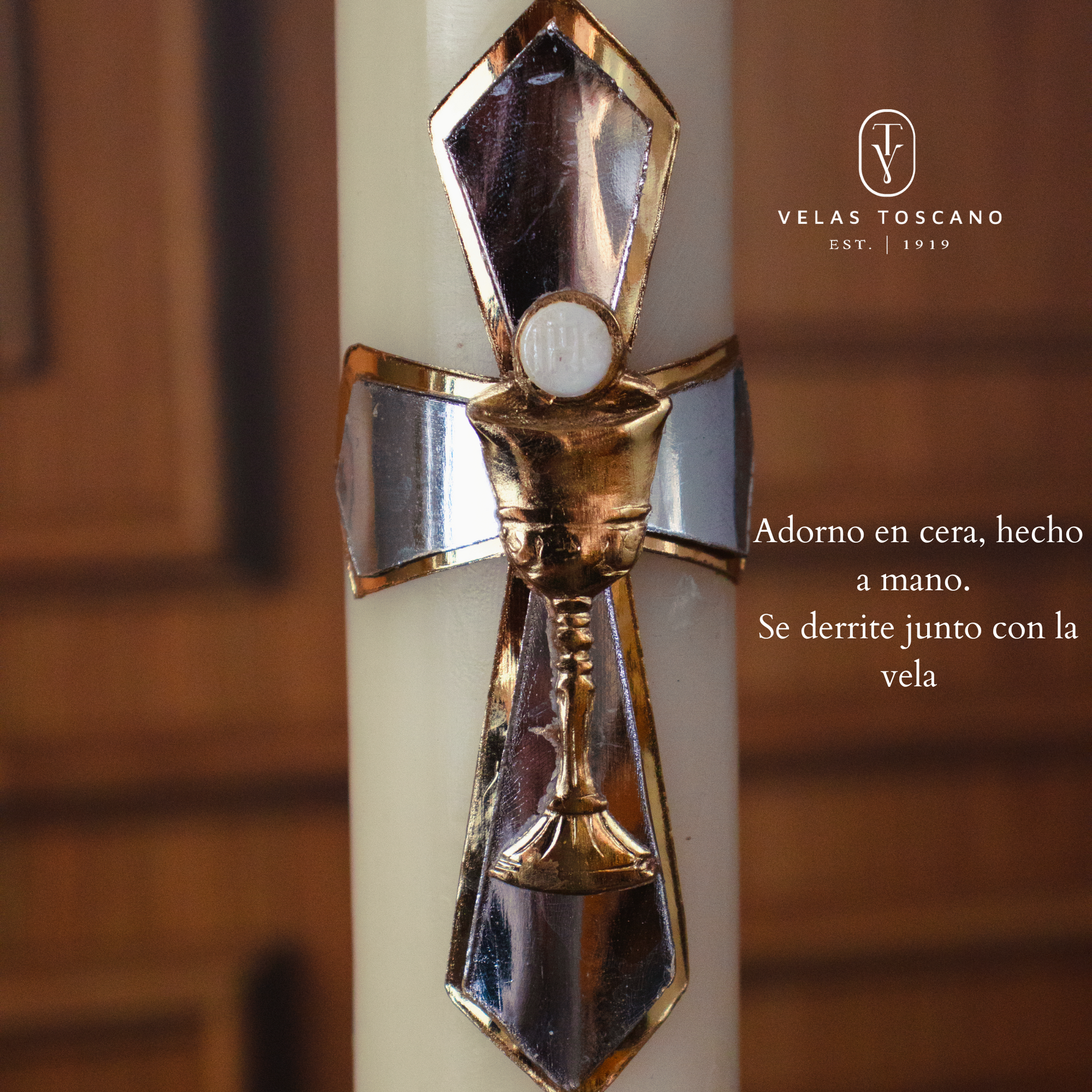 - Esta vela presenta una cruz más tradicional y un acabado brilloso de dorado y plata, acompañando elegantemente al caliz y la ostia
